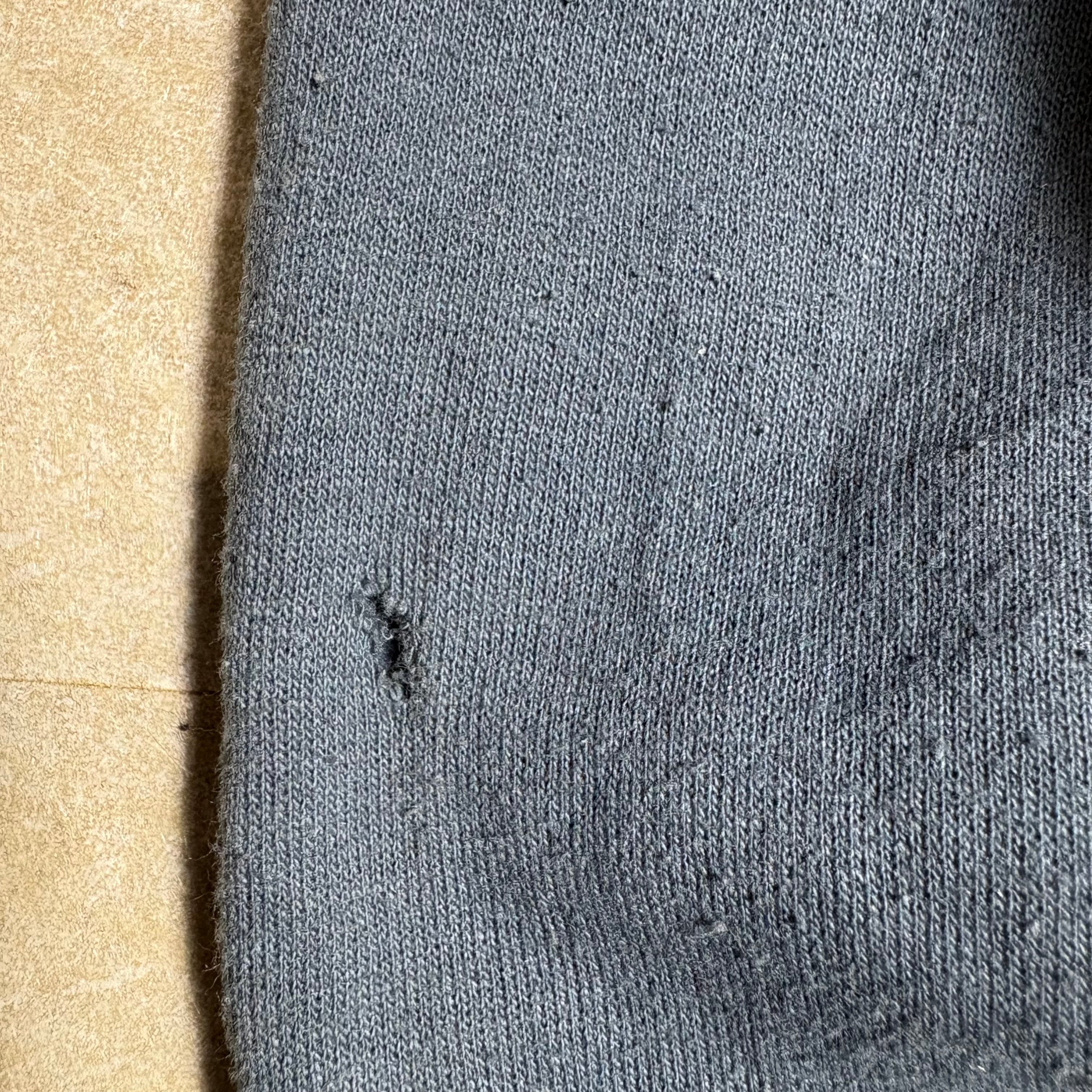 袖丈穴あり、首周り色褪せあり、毛羽立ちあり
